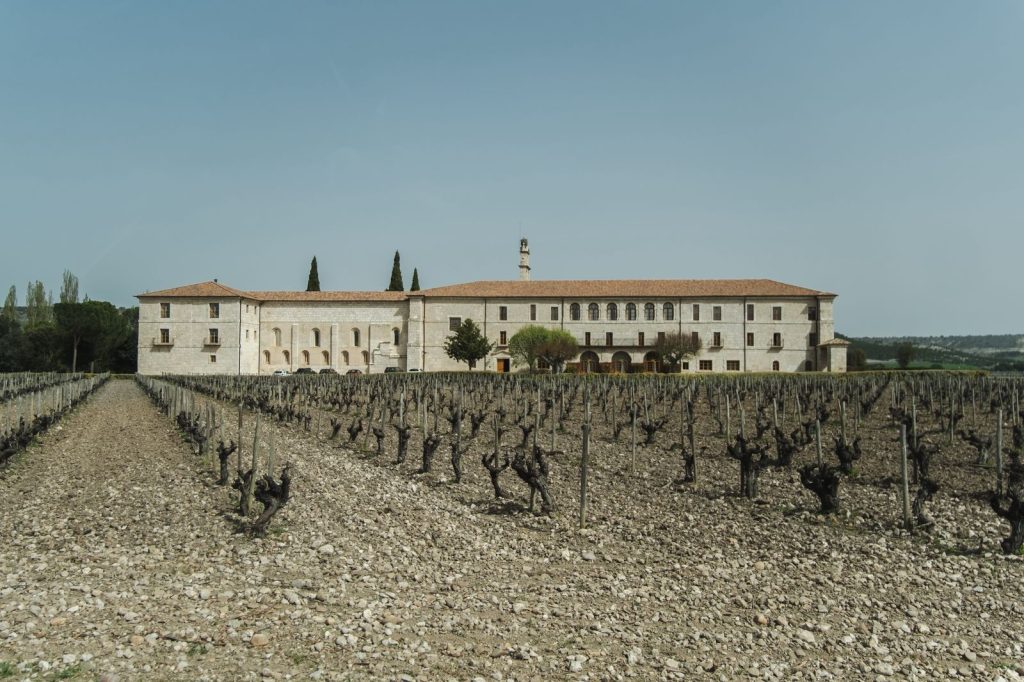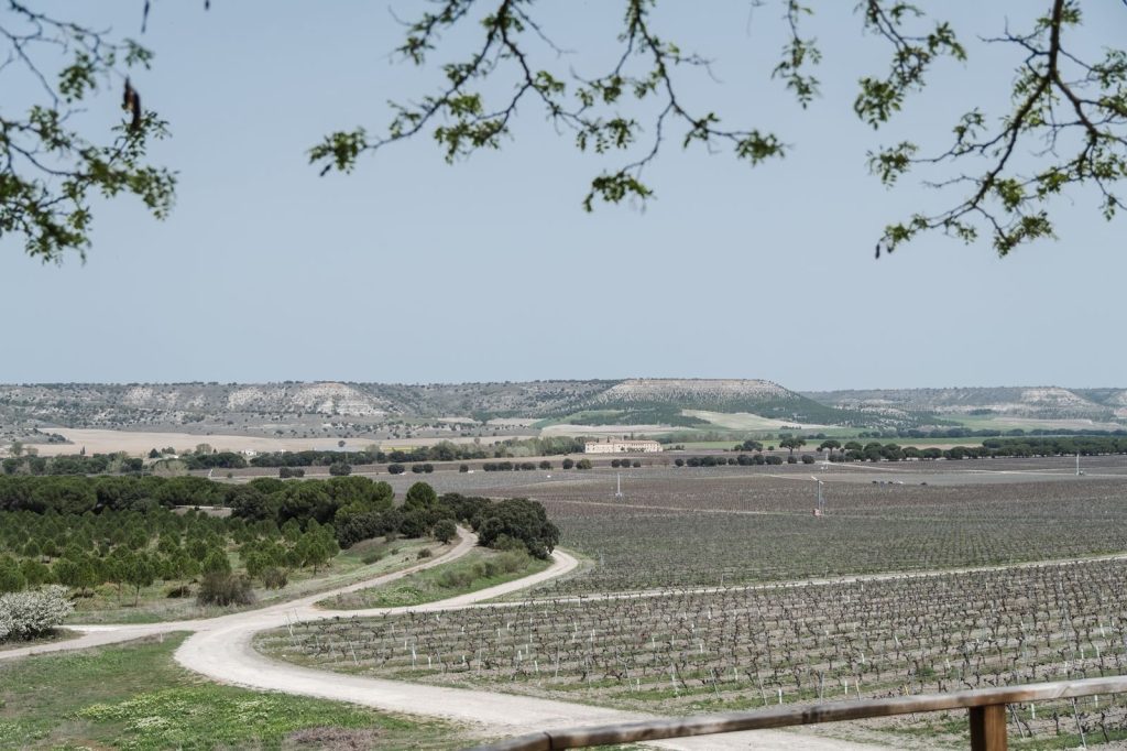Vista panorámica durante la visita Abadía Retuerta en la Ribera del Duero, donde viñedos, historia y arquitectura crean un destino de lujo en España.